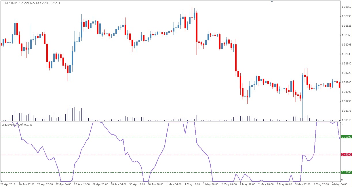 The Laguerre RSI indicator  is a much more advanced version of the basic Relative Strength Index - RSI indicator, shows the weighted trendline in the separate window of the chart. It can be used for easy entry and exit signals. It uses a 4-Element Laguerre filter to provide a (Time Warp) such that the low frequency components are delayed much more than the high frequency components. This enables much smoother filters to be created using shorter amounts of data. Indicator Laguerre RSI is very simple to use. You simply go long when the indicator moves above the 20% mark and go short when the indicator move below 80%. Inputs Laguerre RSI indicator are, gamma (default = 0.7) - ratio, which is used in the calculation of the line and CountBars (default = 950) - Maximum number of bars of the chart, which would be calculated as an indicator. You can adjust the gamma setting to suit the currency and time frame that you are trading to find the optimal value. The default setting is 0.5, which is quite an aggressive setting but if you want to eliminate of false signals you can increase the gamma setting anywhere up to around 0.85. The recommended setting is 0.65.